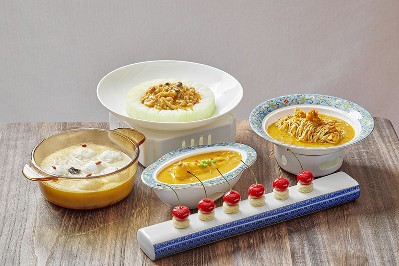 精於京淮菜的「澳門銀河」花悅庭,以精湛手藝將螃蟹的每一絲甜美「抽絲剝繭」,配以烹調 分寸的精準把握,將現拆肥美大閘蟹,化作一道道令人垂涎的秋日佳餚。前菜的鵝肝櫻桃流心 蟹粉是視覺與味覺的雙重盛宴,精選現拆蟹粉搭配紅菜頭的鮮豔色澤,製成櫻桃般的造型,蟹 粉的鮮美與紅菜頭的微甜在舌尖上交織,仿佛是秋天的果實讓人回味無窮。蟹粉貢米釀花膠完 美結合滋補與美味,現拆蟹粉與黃金小米搭配花膠桶慢火細燉,每一口都是熨帖入心的醇香與 溫暖。蘇州蟹粉魚圓將現拆蟹粉與生魚肉手打至緊密交融出細膩滑嫩的魚圓,搭配鯽魚湯的香 濃與芹菜粒、小蜜豆肉的清新,讓人仿佛置身於江南水鄉的秋日風光之中。而 XO 醬黑松露脆蟹腿用濃郁的黑松露醬與 XO 醬,與蟹腿 的鮮美和杏鮑菇的脆嫩相互交織,每一口都是對味覺的極致挑戰,讓人在驚喜中感受到創意與 美味的無限可能。
