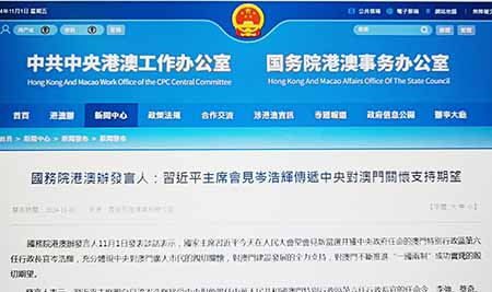 【特訊】國務院港澳辦發言人11月1日發表談話表示,國家主席習近平今天在人民大會堂會見新當選并獲中央政府任命的澳門特别行政區第六任行政長官岑浩輝,充分體現中央對澳門廣大市民的親切關懷,對澳門建設發展的全力支持,對澳門不斷推進“一國兩制”成功實踐的殷切期望。
