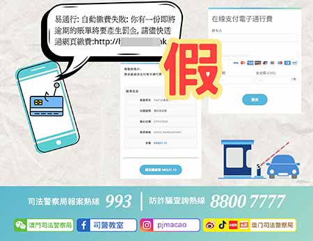【特訊】昨日(4日)司法警察局發現有騙徒假冒香港行車繳費系統“易通行”向澳門流動電話號碼隨機發送釣魚短訊,訛稱市民帳單“即將逾期”並將產生“罰金”,要求市民點擊短訊內附帶之連結進入一個假冒“易通行”的網頁,誘騙市民輸入個人及信用卡資料以補交“逾期費用”,騙徒藉此套取市民信用卡資料並進行未經授權之大額交易。