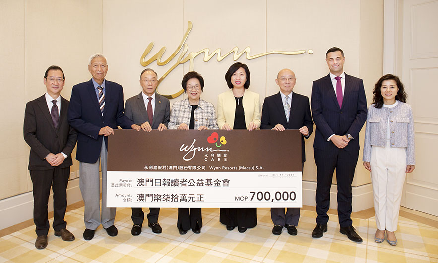 捐贈儀式昨日(6 日)於永利澳門舉行。永利澳門有限公司總裁 董事會副主席陳志玲女士、永利澳 門有限公司財務及行政事務總裁郭富隆先生、永利澳門及永利皇宮社區及政府關係助理副總裁李勁源 先生,代表永利將善款支票交予澳門日報讀者公益基金會,並由該基金會會長賀定一女士、副會長陸 波先生、理事長黃國勝先生、監事長吳柱邦先生及常務副理事長何凱玲女士代表接受。