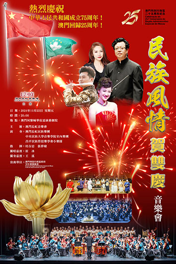 【特訊】為慶祝中華人民共和國成立75周年暨澳門回歸祖國25周年,並促進本澳與內地民族音樂文化交流,澳門長虹音樂會將於11月22日(星期五)晚上八時,在澳門何黎婉華庇道演藝劇院舉辦『民族風情賀雙慶』音樂會。是次音樂會由「澳門長虹民族樂團」、「中央民族大學音樂學院室内樂團」及「北京昌平民族管弦學會」聯合演出,並由兩團常任指揮杜存忠以及張夢婕執棒。是次活動獲澳門特區政府文化發展基金資助。