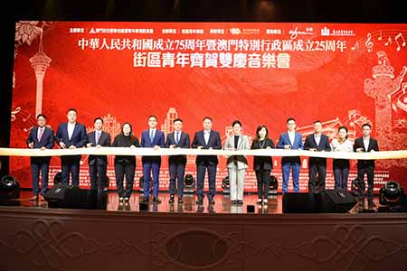 【特訊】為慶祝中華人民共和國成立75周年、澳門回歸25周年,澳門街坊會聯合總會青年事務委員會攜手65個本澳青年社團,於早前成立了“街區青年聯盟”,並精心籌備了一系列慶祝活動。今晚,“街區青年聯盟齊賀雙慶音樂會”在永利皇宮宴會廳隆重舉行,活動旨在加強本地青年對祖國及澳門的認同感與歸屬感,凝聚青年愛國愛澳精神,並鼓勵青年團體加強團結,吸引了逾500位青年才俊共襄盛舉。