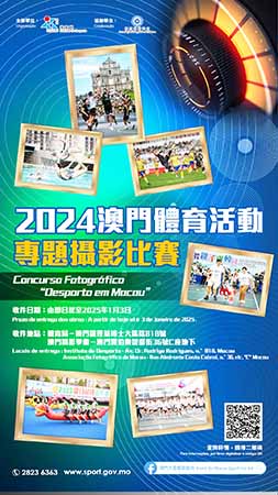 2024「澳門體育活動」專題攝影比賽的參賽作品皆以2024年度澳門舉行之各項體育活動為元素,並分為【競技群英】及【健體歡顏】兩項攝影題材。參賽者遞交作品數量不限,交件地點為:體育局-澳門羅理基博士大馬路818號,及澳門攝影學會-澳門賈伯樂提督街36號C座地下。