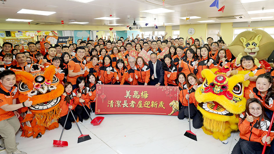 清潔長者屋迎新歲;美高梅已第11年舉辦「清潔長者屋」活動,本年組織220名成員,包括50多名管理層人員,上下一心、身體力行走進筷子基社屋快富樓,為220戶長者進行家居大掃除,協助長者送舊迎新,並為長者們的家居貼上自家設計的賀年揮春。