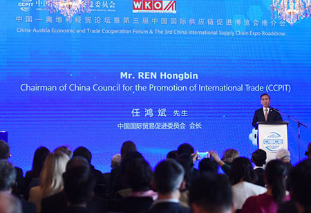 中國貿促會會長任鴻斌積極評價中奧各領域合作取得的新進展,表示中方願與奧方合作夥伴攜手,推動雙方工商界挖掘資源稟賦與產業結構互補優勢,支援兩國企業培育合作新增長點,歡迎奧地利企業和機構參加第三屆鏈博會。