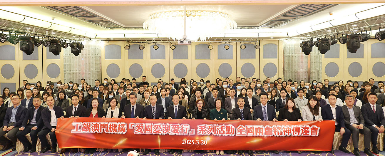 【特訊】工銀澳門日前舉辦“2025‘愛國愛澳愛行’系列活動——全國兩會精神傳達會”,向員工分享“兩會”內容及精神。澳區全國人大代表、中國僑聯副主席、澳門特別行政區行政會委員劉藝良,澳區全國政協委員、澳廣視執行委員會主席、董事會副主席羅崇雯擔任分享嘉賓,工銀澳門董事長高明、行政總裁牛建軍、副行政總裁鄧洪、曹代福、黃獻軍,中國工商銀行澳門分行副總經理石瑩,立法會議員、工銀澳門康委會會長羅彩燕和康委會理事長黃敏賢,以及員工代表200多人出席傳達會。
