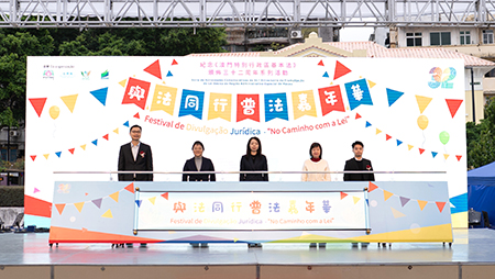 澳門基本法推廣協會、法務局、市政署和教育及青年發展局昨午假塔石廣場合辦「與法同行-普法嘉年華」,紀念《中華人民共和國澳門特別行政區基本法》頒佈三十二周年,法務局局長梁穎妍、中央人民政府駐澳門聯絡辦公室法律工作部王恒部長、澳門基本法推廣協會副理事長兼秘書長何少金、市政署市政管理委員會主席周偉迎和教育及青年發展局代局長丁少雄出席主禮,場面熱鬧。