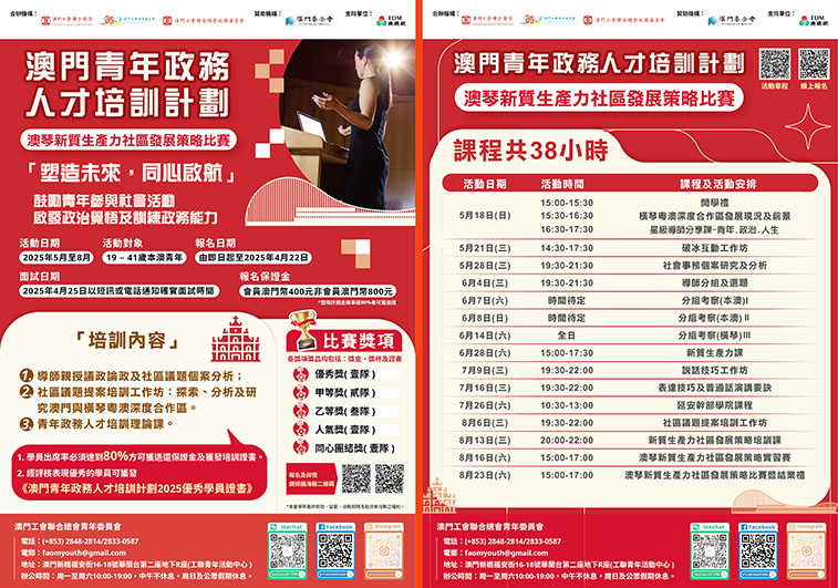 計劃主要特色是由澳門立法會議員及各個領域專業導師帶領學員,透過多樣化的課程和實地考察,引導青年深入思考社會議題,提升政策分析、解題思維及領導協作能力。培訓課程中,導師將向學員親授及分享專業知識和實際經驗,並啟發學員的大局思維觀,提升學員在政務及社區議題上的創新能力及解題能力。最後,學員會進行澳琴新質生產力社區發展策略”比賽,並設優秀獎、甲等獎、乙等獎、人氣獎、同心團結獎及優秀學員獎,以鼓勵培訓計劃表現優秀的組別及學員。有興趣者可瀏覽https://reurl.cc/VYRzb5填妥報名表,或親臨工聯青年活動中心(福安街16-18號華蘭台第二座地下R座)報名,查詢可聯絡微信客服faomyouth_1990/68568967、電郵faomyouth@gmail.com、或致電二八四八‧二八一四
