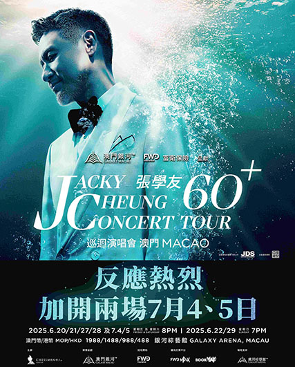 【特訊】華語樂壇「歌神」張學友第十個個人演唱會——《「澳門銀河™」榮譽呈獻 FWD 富衛保險冠名贊助–張學友60+巡迴演唱會 澳門》將於今年6月在澳門最大的室內綜藝館——銀河綜藝館連開6場以饗樂迷,門票均已火速售罄。在一眾「友迷」的殷切盼望下,是次澳門凱旋站將於7月4、5日加開兩場,并且早前售罄的首 6 場將特別加開極少量澳門幣1988元座位(視線受阻區)。張學友將成為銀河綜藝館開辦個人巡演場次最多的天王級歌手。加場場次門票及首6場加開座位門票將一同於4月22日中午12時通過銀河票務、FWD MAX、大麥、BOOKYAY、貓眼、 uutix、Mpay 澳門錢包APP、澳門售票網、紛玩島小程序同步公開發售。