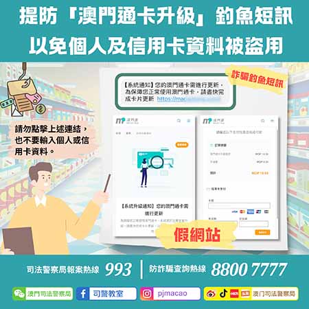 經司法警察局調查,發現若市民點撃,會進入一個假冒「澳門通」的釣魚網站,該網站會要求市民填寫姓名、手機號碼、身份證等個人資訊,並要求輸入信用卡卡號、有效期及安全碼等資料以支付10元的「澳門通卡升級費用」。騙徒在成功盜取相關資料後,利用這些資料進行未經授權的大額交易。