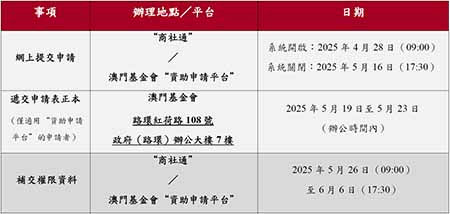 為配合赴外交流活動的規劃情況,交流活動資助計劃特設次輪申請,相關章程可瀏覽澳基會網頁。上述資助計劃網上(“商社通”及“資助申請平台”)提交申請的截止日期為5月16日,社團除可透過澳基會的“資助申請平台”申請外,澳基會鼓勵社團優先選用“商社通”提交申請,全程線上辦理,無須親臨遞交紙本文件,更可即時查看申請進度及審批結果。倘透過“資助申請平台”提交申請的社團請留意,完成網上提交申請後,還須於5月19日至23日的辦公時間內親臨澳基會(地址:路環紅荷路108號政府(路環)辦公大樓7樓)遞交由法定代理人或具權限的受權人簽署及蓋上機構印章之申請表正本,未有按時交回申請表的申請者將視為自動放棄申請。澳基會表示,如實詳盡、認真細緻填寫申請表是申請資助的最基本要求。為確保公帑的合理使用,資助申請以擇優批給為原則,以項目為主導,批給機制帶競爭性,過往曾獲資助的項目並非必然獲批,澳基會根據活動的內容素質及規劃的完善程度、活動效益、預算合理性、執行能力、經驗及履行義務配合度進行綜合評審,申請者應深入了解資助計劃的相關規定。澳基會強調,交流活動絶非旅遊玩樂,必須具實質交流內容、注重社會效益和實際成效,請社團務必謹慎規劃好行程。