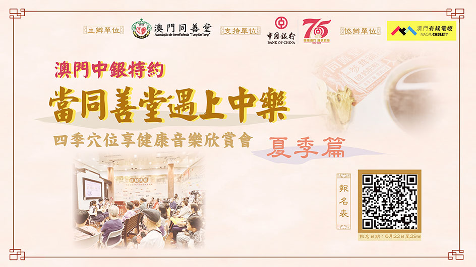 電視協辦的「當同善堂遇上中樂——四季穴位享健康」音樂欣賞會,本年度最後一場音樂會「夏季篇」將於七月五日在同善堂歷史檔案陳列館舉行,音樂會一直延續「以樂為藥」的概念,以中樂和中醫藥兩優秀國粹透過同善堂作為平台進行有機結合,邀請本地青年中樂團演奏與時節相關的樂曲,以及由同善堂中醫生講解符合夏季的中醫穴位知識,讓參與者以藝術角度持續認識我國優秀中華傳統文化。
