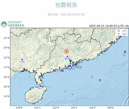 中國地震台網測定,昨日傍晚六時四十八分,廣東省清遠市清城區發生四點三級地震,震源深度十公里。地球物理氣象局表示,初步分析,本澳時間六月二十三日昨日傍晚六時四十八分五十秒,於廣東省清遠市發生四點三級地震,震源深度約為十公里,震中約位於北緯二十三點六十二度,東經一百一十三點十七度,距離澳門西北偏北約一百六十六公里。截至昨日晚上七時,氣象局收到三名市民報告感覺到是次地震。