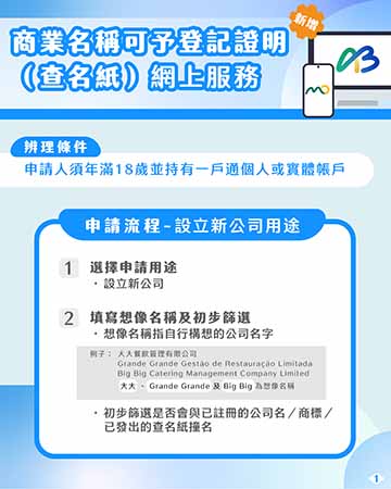 在商業名稱可予登記證明(即查名紙)方面,市民可透過「一戶通」或「商社通」申請查名紙,直接線上提取電子版查名紙或線下領取紙本版,免卻以往市民在設立公司、變更公司名稱或業務前,需親臨登記局申請及領取查名紙,以確認擬採用的商業名稱(公司名)可予以登記。