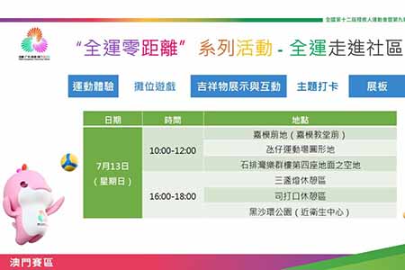【特訊】為讓市民近距離感受全運會的熱烈氛圍,共同迎接11、12月舉行的第十五屆全國運動會及全國第十二屆殘疾人運動會暨第九屆特殊奧林匹克運動會(下稱“十五運會和殘特奧會”),十五運會及殘特奧會澳門賽區籌備辦公室將於7月13日再次舉行「全運走進社區」活動,以輕鬆有趣的互動方式加深市民對全運會的認識,為全運會預熱。