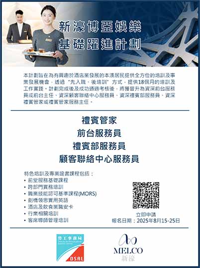 【特訊】為有意投身酒店業發展的本澳居民,提供全方位的培訓及事業發展機會,勞工事務局(下稱“勞工局”)和新濠博亞娛樂有限公司(下稱“新濠博亞”)合作推出“新濠博亞娛樂基礎躍進計劃—酒店營運”(下稱“計劃”),以“先入職、後培訓”方式,為有興趣從事酒店業範疇的本澳居民,提供事業發展機會,計劃由8月15日起接受申請。