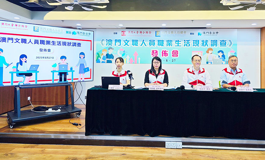 工聯和文職人員總會就本澳文職人員職業生活現狀進行調查,在今年一月至八月期間收回一千五百一十有效問卷,查發現兩成七受訪者對職業前景感樂觀,而資料顯示六月金融業等文職崗位仍有九百名外僱,當中過半屬非專業崗位,建議明確外僱退場安排,並為金融等行業及文職崗位設定管理職位本地化指標;制定培訓課時制度,培訓成果與晉升掛鉤。調查結果又顯示,八成三受訪者對勞動法規認知不足,有近三成曾經權益受損,四分之一認為薪酬不匹配工作量,四成三工作壓力影響身心健康,但僅有一成八企業提供心理支持。