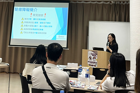 吳嘉熙言語治療師則講解發聲原理、聲線評估過程、自我檢測方法,及現場教授多種實用護聲技巧,包括“如何減少損害聲線健康”的各種行為及習慣、肌肉及喉部放鬆手法及腹式呼吸等。參與者在治療師的指導下親身練習,現場氣氛積極熱烈。