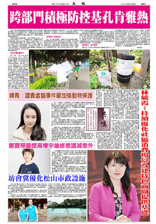 呼籲樓宇業權人定期做好大廈檢查維修工作,提高樓宇保養意識,減少意外發生。她並建議當局建立跨部門合作機制,及設置舊式樓宇資料庫,督促樓宇業權人及時維護修復,防止樓宇結構進一步惡化,保障居民、旅客出行安全,改善街道環境。