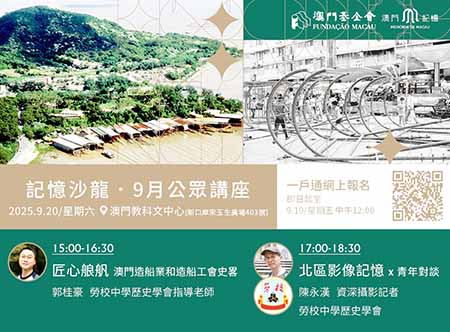 9月“記憶沙龍”公眾講座將於9月20日(星期六)下午於澳門教科文中心舉行,分別由勞校中學歷史學會指導老師郭桂豪於3時至4時半主講“匠心艆舤—澳門造船業和造船工會史畧”,以及由資深攝影記者陳永漢與勞校中學歷史學會於5時至6時半共同帶來的“北區影像記憶 x 青年對談”。有興趣的市民即日起至9月19日(星期五)中午12時前可透過“澳門公共服務一戶通”手機應用程式或通過以下連結https://activity.mo.gov.mo報名,名額有限,先到先得,歡迎市民踴躍報名。