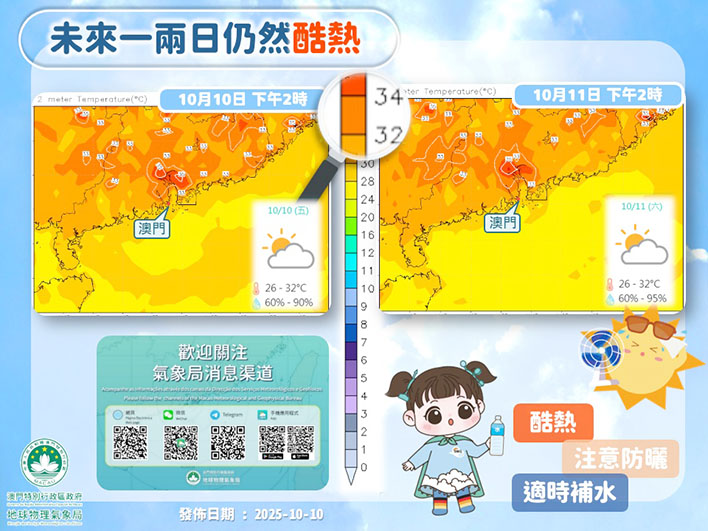 氣象局表示,近日日間天氣雖仍酷熱,但早晚已開始有點點秋意,持續受高空反氣旋影響,加上風力較小,未來一兩日日間天氣仍然酷熱,「秋老虎」天氣下,巿民身處戶外要提防中暑,適時補充水分。預料下週初轉受一股偏東氣流影響,同時一道廣闊低壓槽亦會移近華南沿岸,兩者共同影響下,週二至週三(十四至十五日)驟雨會較頻密及有雷暴。然而秋雨過後,高空反氣旋會再度增強,天氣又將重回「秋老虎」模式。
