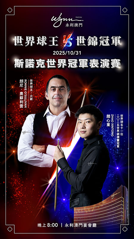(Ronnie O'Sullivan),與今年歷史性成為中國及亞洲首位斯諾克世錦賽冠軍的趙心童(Zhao Xintong)同場獻技,上演一場精彩絕倫的國際級斯諾克對決,為市民及旅客帶來難忘的體育盛宴。