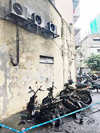 【特訊】草堆街附近的蠔里昨日清晨發生懷疑縱火燒車案,四部電單車被燒剩車架,火勢亦波及另外兩部電單車,消防接報到場將火救熄,無人受傷。司警正調查案件。
