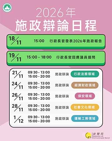 至於各領域施政方針的立法會辯論會議,日程分別是:11月21日辯論行政法務領域、24日辯論經濟財政領域、26日辯論保安領域、28日辯論社會文化領域,以及12月1日辯論運輸工務領域的施政方針。