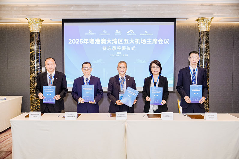 五大機場於會上圍繞主題達成戰略共識,並正式簽署會議備忘錄。五大機場承諾延續「攜手合作、互助支援、創新開拓、共同發展」的宗旨,深化運營協同、智慧機場建設及商業合作,重點優化空域資源配置與貨運物流整合,以提升大灣區航空樞紐的國際競爭力與服務效能,共同推動世界級機場群建設,為區域經濟發展與全球航空網絡提供關鍵支撐。