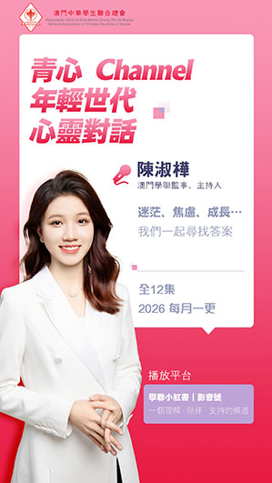 【特訊】為提升澳門學生心理健康素質,澳門中華學生聯合總會計劃於2026年推出專為青年學生打造的心靈頻道——「青心Channel」,該頻道以「推動青年關注心理健康,增強情緒調適與自我認知能力」為宗旨,計劃每月推出一集,全年共十二集,內容緊貼青年學生成長歷程,涵蓋四校聯考壓力調適、五四精神傳承、畢業抉擇等,由主持人圍繞這些生命課題進行真摯分享,為觀眾提供理解、陪伴與支持,構建正向成長的心靈平台。