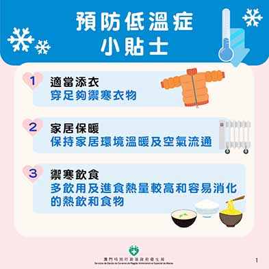 衛生局提醒長者、慢性病患者等要適當添衣,保持家居環境溫暖及空氣流通,多飲用及進食熱量較高和容易消化的熱飲和食物,亦要維持適量運動使身體產生熱能,幫助維持體溫,以及密切留意天氣轉變。若居民發現有人患上低溫症,或出現體溫持續下降、肌肉僵硬、心跳減慢、神智昏亂甚至昏迷等症狀,應盡快將患者送院救治。