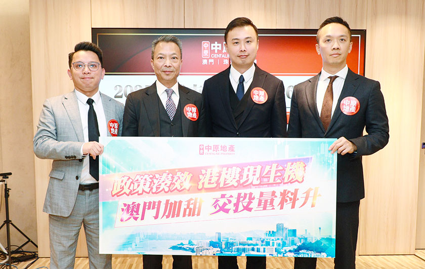 中原澳門及珠海橫琴昨午舉行二零二五樓市回顧及二零二六年前瞻發佈會。中原(工商舖)、中原澳門及橫琴董事總經理潘志明、中原澳門及珠海橫琴董事何兆恆、澳門中原豪宅及氹仔住宅部區域董事羅俊明、澳門中原(工商舖)區域董事李肇成主講。