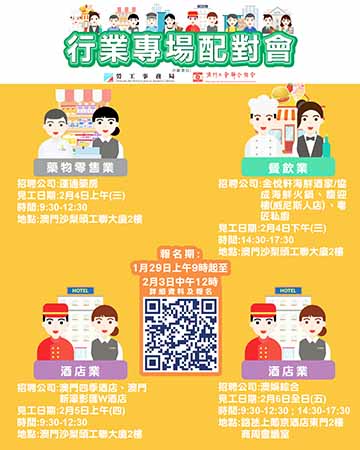 2月4日下午舉辦餐飲業專場配對會,參與企業有“金悅軒海鮮酒家/協成海鮮火鍋”、“馥迎樓(威尼斯人店)”及“粵匠私廚”,合共提供198個職位空缺,涉及部長、廚師、餐飲服務員、魚池管理員、廚師助理及雜工等崗位。