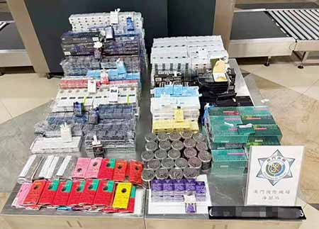 海關持續進行「冬防行動」。上月二十三至二十九日,分別在澳門國際機場、關閘口岸及港珠澳大橋澳門口岸截獲十一宗「走水貨」案,拘捕十一人包括一名學生,起出一百三十六部舊手機、三萬七千一百五十支香煙及一千多克煙絲、六千二百支電子煙煙彈、四十公斤銀粒、十四件藥物及兩部舊平板電腦。