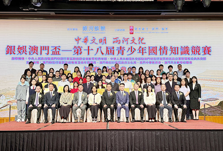 由銀河娛樂集團冠名贊助,國情教育(澳門)協會主辦之「銀娛澳門盃—第十八屆青少年國情知識競賽」初賽頒獎典禮,昨午在星際酒店舉行。中聯辦教育和青年部處長程啟銀、外交部駐澳特派員公署新聞和公共外交部副主任梁巧智、教青局青年發展處處長趙寶威、文化局文化遺產保護處處長何卓鋒、澳區全國人大代表何敬麟、澳區全國政協委員黃竹君等出席。