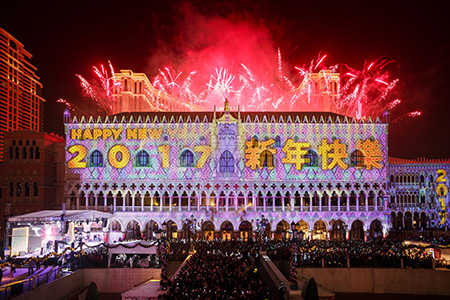 澳門威尼斯人的除夕夜戶外倒數活動上,除了Lucky 5樂隊以獨特的音樂震撼觀眾外,除夕夜舞蹈表演團隊亦以多首流行榜大熱歌曲配合節奏明快的舞蹈,帶來一連串勁歌熱舞。另外,美國人氣放克搖滾樂隊Andy Frasco & The U.N.的表演更帶領當晚的活動走向高潮,使在場觀眾紛紛一同熱舞。 而在2016年的最後十分鐘,特別為除夕活動設計的投射匯演亦把澳門威尼斯人的外牆轉化成計時大鐘,與觀眾一同倒數。