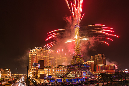 在澳門巴黎人參與戶外倒數活動的訪客則欣賞了法式肯肯舞及社交舞等表演。而多位DJ、澳門金沙度假區的駐場樂隊Blue Note,以及香港著名樂隊之一的Mr.之亦上演了精彩的演出。當晚的重頭戲之一是巴黎鐵塔的除夕音樂燈光倒數及炫目的煙花匯演。