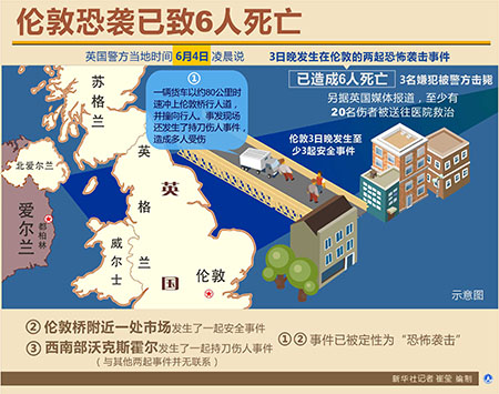 【中新社北京6月4日電】綜合消息:當地時間6月3日晚,英國倫敦連續發生三起襲擊事件,其中發生在市中心倫敦橋和巴羅集市(Borough Market)的兩起襲擊已被確認為恐怖襲擊。當地媒體最新消息稱,襲擊已造成至少6人喪生,有3名襲擊者被警方擊斃。