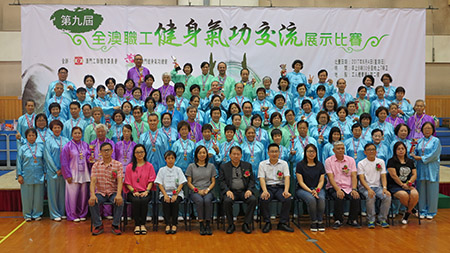 【特訊】由澳門工聯體育委員會及澳門健身氣功總會合辦的“第九屆全澳職工健身氣功交流展示比賽”於6月4日(星期日)早上八點半至下午五點半假工人體育場A場舉行,出席嘉賓包括中央駐澳門聯絡辦公室社會工作部代表劉琨、澳門特別行政區政府體育局處長盧綺雲、澳門工會聯合總會副理事長李靜儀、工聯體育委員會主任暨澳門健身氣功總會理事長阮愛武、工聯體育委會副主任暨賽事統籌岑寶華、澳門健身氣功總會副理事長潘敬文、工聯體委會常務副主任袁麗芬、工聯體育委員會副主任李錦華、阮添池、梁玉卿等。阮愛武表示,這項比賽自舉辦以來,每年反應非常踴躍,參加人數不斷增加。而舉辦這項比賽的目的,是希望讓參加培訓學員展示學習成果,以及藉此交流學習,健身強體,今後該會將繼續推廣普及健身氣功活動,鼓勵各業工友及大眾學習,為提高各業職工、市民身體素質、為共建健康和諧社會多作貢獻。