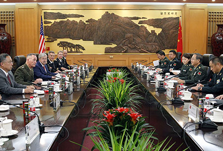 房峰輝說,習近平主席與特朗普總統高度重視發展兩軍關係,共同規劃了兩軍關係發展的藍圖,指明了兩軍合作的方向。合作是中美兩國唯一正確的選擇,中美兩軍完全能够成為很好的合作夥伴。中美兩軍要把兩國元首達成的重要共識貫徹落實好,把中美兩軍關係穩定發展的態勢保持好,把兩軍在共同利益領域的合作維護拓展好,把影響兩軍關係發展的不利因素妥善處理好。中國軍隊願與美方共同努力,加強戰略溝通,增進戰略互信,深化務實合作,妥處矛盾分歧,有效管控風險,推動兩軍關係持續穩定發展,成為兩國關係的重要穩定因素。