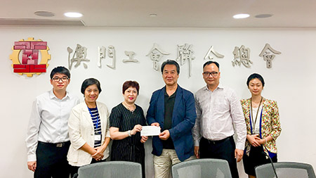 閩信保險為支持本澳災後重建,分行經理顏綺虹及助理經理鄭仲日前到訪工聯總會,並向工聯總會捐款十萬澳門元,作為風災善後之用。該款項由工聯會長陳錦鳴、監事長梁玉華、助理秘書長黎秀瑛代表接收。