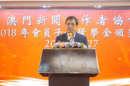 【特訊】澳門新聞工作者協會昨(二十七)日舉行「二○一八年會員子女獎學金頒獎禮」,向逾一百名會員優秀子女頒發獎學金,以示鼓勵,今年共發放獎學金額六萬九千六百元。該會理事長余建棟勉勵各獲獎同學要繼續努力,爭取更好的學業成績,擴闊視野,關心家人、關心澳門、關心祖國、關心世界,未來為社會作出貢獻。
