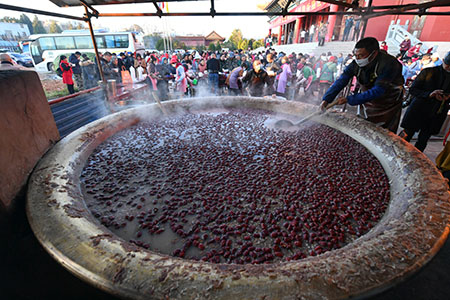王昊昊在湖南南嶽報道:當天湖南衡陽南嶽大廟熬制了1萬份臘八粥免費贈與遊客和市民。一大早,大廟的工作人員就將早已準備好的紅豆、葡萄、枸杞、花生米等21種配料倒入直徑2.36米、高1.8米、重5.6噸的“千僧鍋”。攪拌、加料、盛碗,隨著一碗碗熱氣騰騰的臘八粥出鍋,早就聞訊趕來排隊的遊客和市民,喝上了象徵“福壽”的臘八粥。