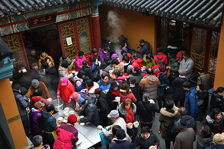 據南京市玄奘寺住持傳真法師介紹,寺廟將向市民免費派粥作為一種傳統,每年都會提前一個星期精心準備不同口味的臘八粥。“不到1個小時,寺廟準備的兩萬份臘八粥已經派送一空。現正加緊‘補貨’,希望所有來到現場的市民都能討到‘好彩頭’。”傳真法師說。