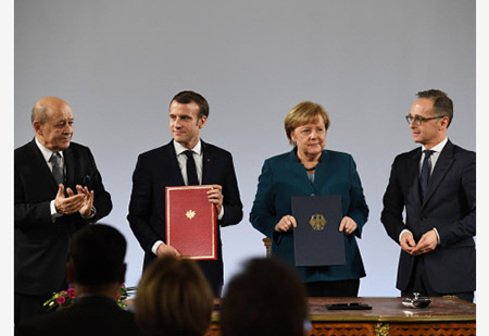 馬克龍表示,法國與德國要確認兩國對歐洲肩負的責任。他同時呼籲正視歐洲目前面臨的多項挑戰,如英國“脫歐”及民粹主義等。馬克龍期待兩國的新合作條約能够在變化中的世界裡保障兩國民眾的權益。
