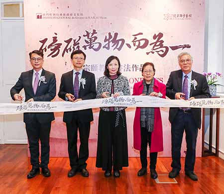 【特訊】由文化局舉辦的“磅礡萬物而為一──饒宗頤教授書法作品展”於1月25日(星期五)下午3時在饒宗頤學藝館開幕。文化局局長穆欣欣、中央人民政府駐澳門特別行政區聯絡辦公室宣傳文化部副處長辛建波、饒學研究基金永遠會長饒清芬、香港大學饒宗頤學術館之友副會長李俊鳴、澳門頤園書畫會常務副會長蕭春源出席主禮。文化局副局長梁惠敏、香港大學饒宗頤學術館副館長(藝術)鄧偉雄博士、香港大學饒宗頤學術館副館長(學術)鄭煒明博士、文化局學術及出版處代處長袁紹珊出席觀禮,場面熱鬧。