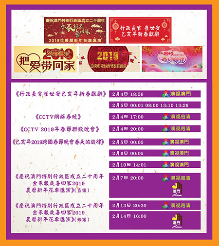 電視頻道將播放《行政長官崔世安己亥年新春獻辭》、《慶祝澳門特別行政區成立二十周年-金豕報歲喜回家 2019 農曆新年花車匯演》、《龍鳯呈祥大戲台》,以及一連串內地新春晚會,
