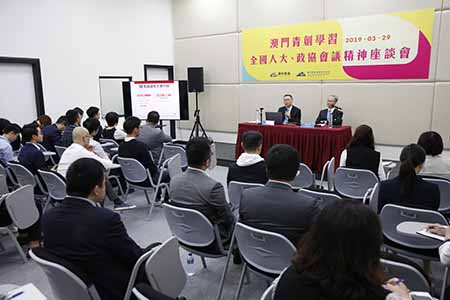 座談會昨日上午十一時在創孵中心舉行,崔世平代表重點分享了全國人大會議情況、國務院政府工作報告、人大常委會工作報告、「兩高報告」以及國務院副總理韓正參加澳門代表團的審議。韓正副總理在會上提出「四點積極」,冀積極參與慶祝澳門回歸二十周年活動,同時支持特區政府做好換屆工作、推進澳門經濟適度多元發展,並關心幫助澳門青年成長發展。國家多番關注澳青年發展,提供良好條件「搭台搭梯」,崔世平勉勵澳青年也要主動「上台」、「爬梯」,積極裝備自我,融入大灣區建設。