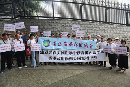 當天,香港海南社團總會上午來到美國駐港澳總領事館門外,手舉標語,強烈譴責美國干預香港內部事務。