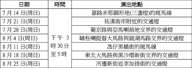 由交通事務局推出的「交通有禮」劇場一共有八場,每次上演兩場,每隔30分鐘一場,每場約半小時。演出期間,演員會將紀念品贈予遵守交通規則的市民和旅客,以作獎勵,餘下7場的演出日期、時間及地點請見附表。有興趣來過招的市民及旅客,別錯過機會,看準詳情到各演出地點與舞林高手比「武」一番!
